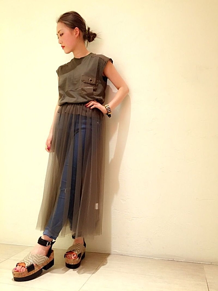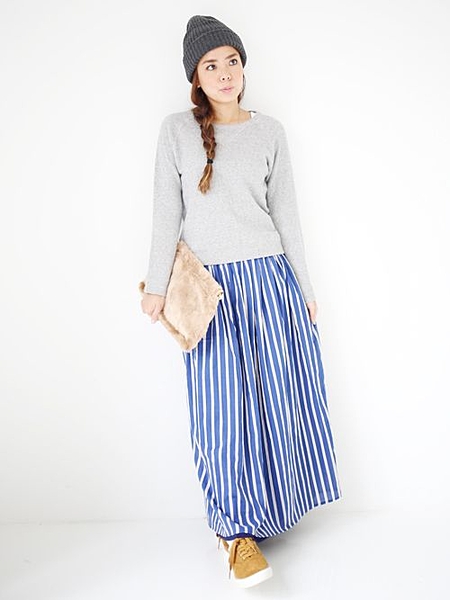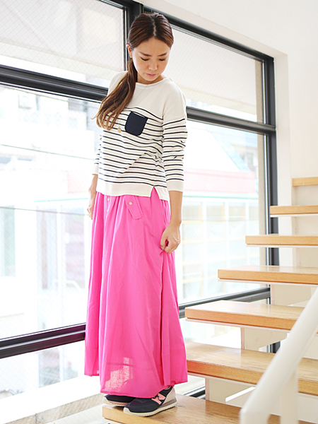 今年も注目のストライブ柄をシフォン素材で仕上げたマキシスカートはモードに着こなせる簡単アイテムです☆