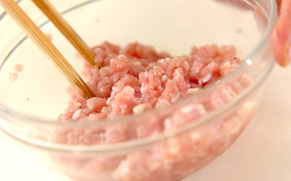 ・鶏ひき肉に<下味>の材料を加え、混ぜ合わせる。