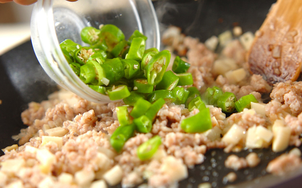 1、フライパンにサラダ油を熱して白ネギを炒め、しんなりしたら鶏ひき肉をポロポロになるまで炒め合わせる。水煮タケノコ、シシトウを加え、さらに炒め合わせる。