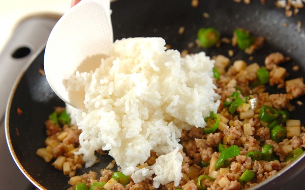 2、<調味料>を加えてサッと炒め、さらにご飯を加えて炒め合わせ、器に盛る。