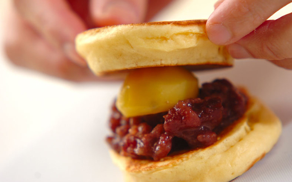 3、穴が空いたらひっくり返して両面焼き、冷めたらゆで小豆と栗の甘露煮をはさむ。