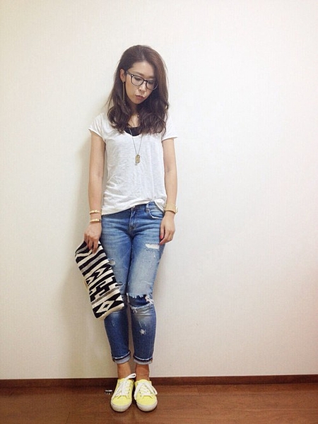 シンプルなコーデに差し色でスリッポンスニーカーを。