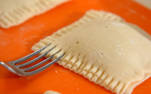 4、(3)にもう1枚のパイシートを上からかぶせ、縁をフォークなどで押さえる(4個作る)。飾り用に残りのパイシートをジャックランタンなどのクッキー型で抜く。