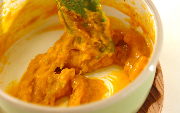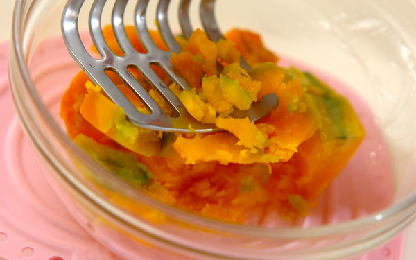 1、<パンプキンクリーム>を作る。耐熱容器にカボチャを入れ、ラップをして電子レンジで約3分加熱する。竹串がスッと刺さったら、熱いうちにマッシャーなどでつぶす。