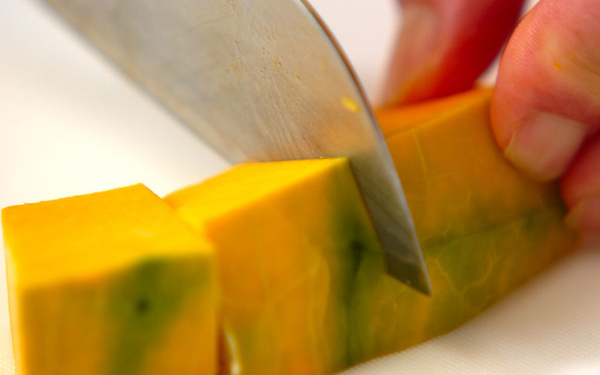 ・カボチャは皮をむいて種とワタを取り除き、4cm角くらいの大きさに切る。冷凍パイシートを冷蔵庫に入れて半冷凍にしておく。