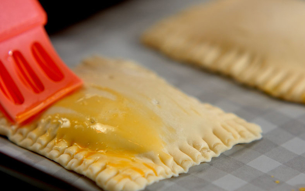 5、(4)に<卵液>を薄くぬって、200℃に予熱しておいたオーブンで約20分焼く。