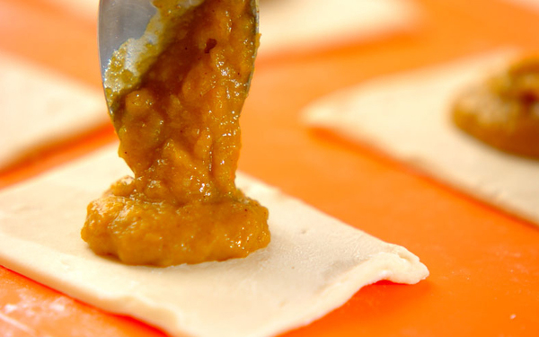 3、打ち粉をした台の上に、冷凍パイシートを置いて麺棒で少し伸ばす。飾り用に少し残し、それ以外を4等分に切る。切った1枚分に<パンプキンクリーム>を1/4量のせる。