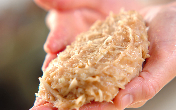 3、分量外のサラダ油を手にぬり、空気抜きをしながら形を整え、フライパンで中火にかける。