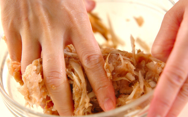 2、ボウルに<ハンバーグダネ>の材料を入れて粘りがでるまで練り混ぜる。