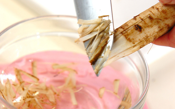 1、ゴボウはタワシできれいにこすり洗いし、細かめのささがきにして水に放ち、水気をよくきる。玉ネギはみじん切りにする。フライパンにサラダ油を薄くひいておく。<おろしポン酢>の材料を混ぜておく。