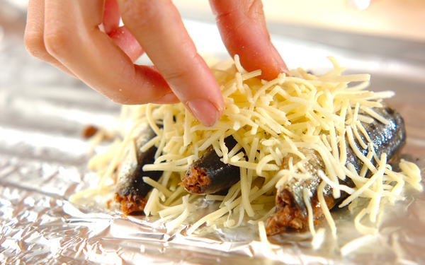 2、食パンはトーストして片面に薄くバターをぬる。トースターの天板にアルミホイルを敷き、イワシを並べ、ピザ用チーズを等分にのせてチーズが溶けるまで4~5分焼く。