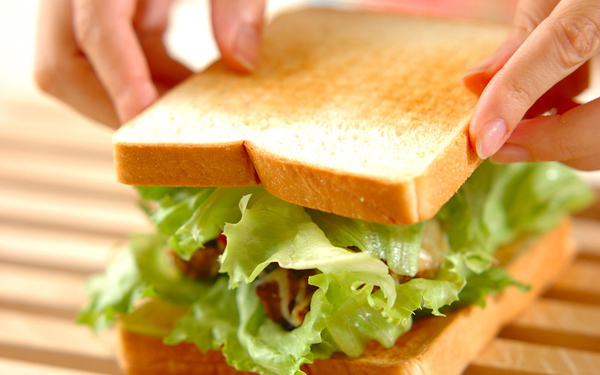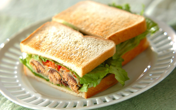 3、(2)の食パンのバターをぬった面にレタスを敷き、イワシをのせて上にプチトマトを並べる。レタスをのせ、もう1枚の食パンで挟み、食べやすい大きさに切る。