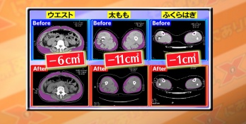 女優・床嶋佳子は、ウエスト(—6cm2)、太もも(—11cm2)、ふくらはぎ(—1cm2)と皮下脂肪が減少、さらにはウエストサイズは(—2.5cm)と目に見えてエクササイズの効果があった。一般被験者3名も皮下脂肪が減少するなど被験者全員“下半身太り”改善の兆しが見えた。