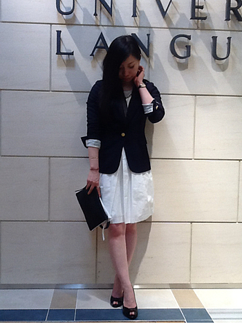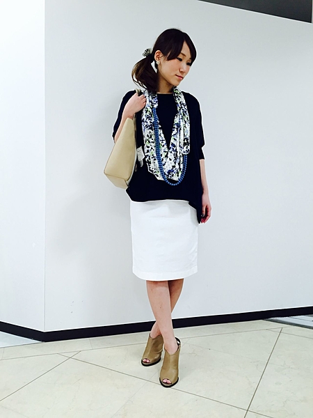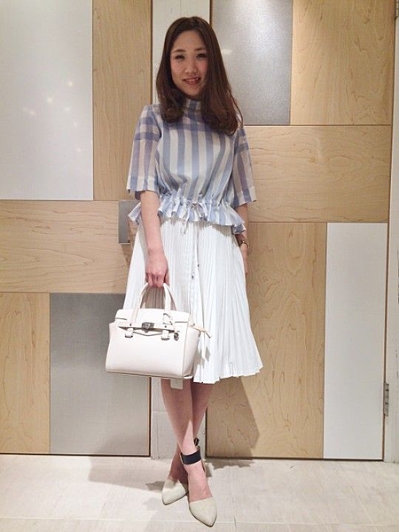 白にはライトブルーやブラウス、パステル系のカーデなどを合わせると爽やかなコーディネートに。