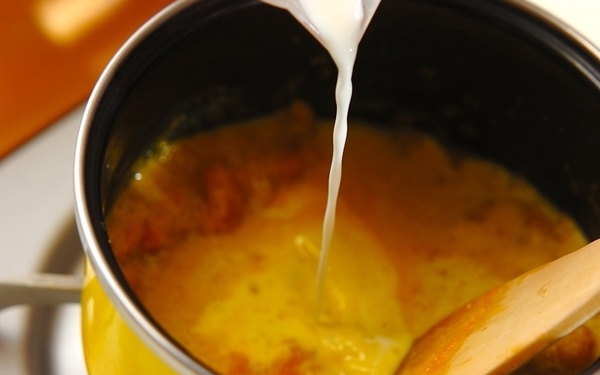 4、牛乳を少しずつ加えて、混ぜ合わせる。塩、コショウで味を調える。器に注ぎ入れ、クルトンを浮かべる。