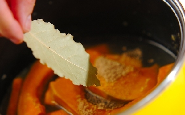 3、蓋をして、沸騰したら弱火にして加熱する。カボチャが煮崩れたらローリエを取り出し、つぶす。