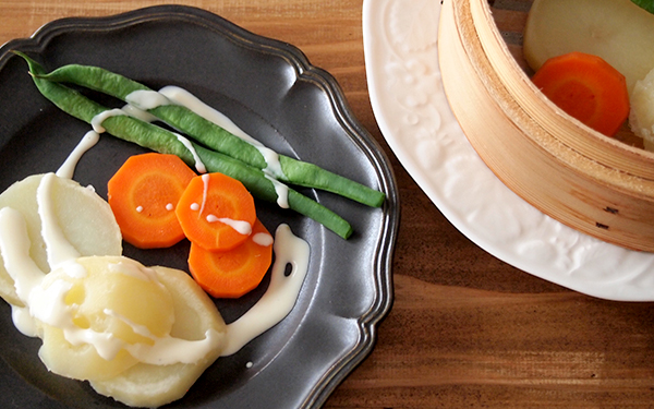 ホットサラダで特におすすめなのは蒸す(スチーム)です。茹でる場合よりも栄養分が外に流出せず、また水っぽくならないの、栄養素も旨みもギュッと詰まった、濃いおいしさを味わえます。