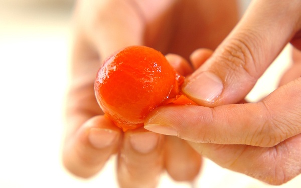 大量のプチトマトを湯むきするコツは、ヘタを取り、ヘタの反対側に楊枝や竹串で小さな穴をあけた後、熱湯→冷水の順に、数分浸すこと。プチトマトの側面の皮を親指と人差し指でつまむようにすると、簡単に皮がむけるようになりますよ。