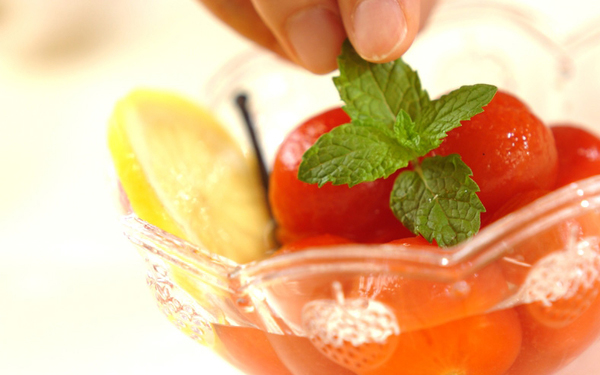 2、鍋ごと氷水につけて粗熱を取り、冷めたら冷蔵庫で冷やす。よく冷えたら器に盛り、ミントの葉を飾る。