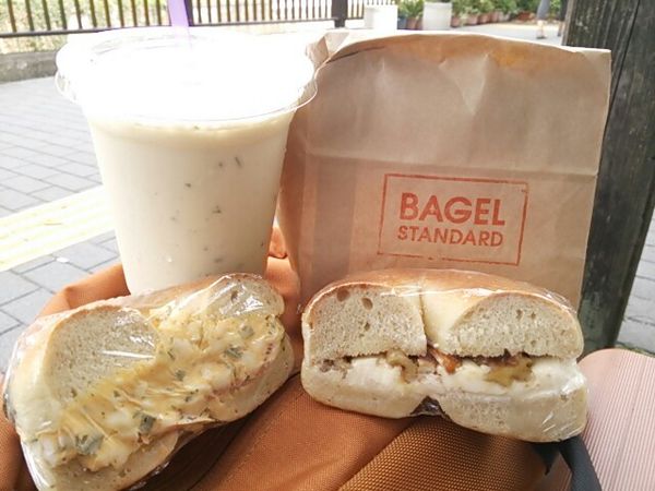 【ベーグル】中目黒界隈。BAGELstandardにてベーグル購入。サンドウィッチ(エッグ&ハム、ナッツクリーム)とパイナップルバナナジュース。目黒川沿のベンチにて遅い昼飯。サンドウィッチいただき! http://t.co/bhEy3K7unh