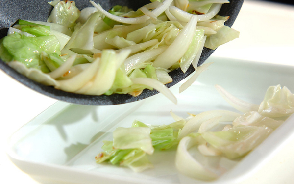2、フライパンにサラダ油大さじ1を熱し、キャベツ、玉ネギ、ニンニクを炒め、しんなりしたらいったん取り出す。