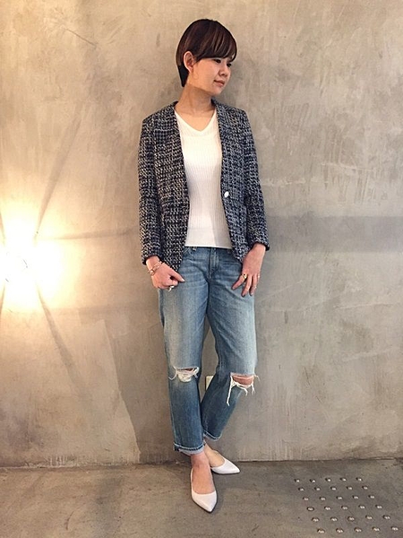 ダメージボーイフレンドデニムをジャケットとし白Tでシンプルきれい目に!