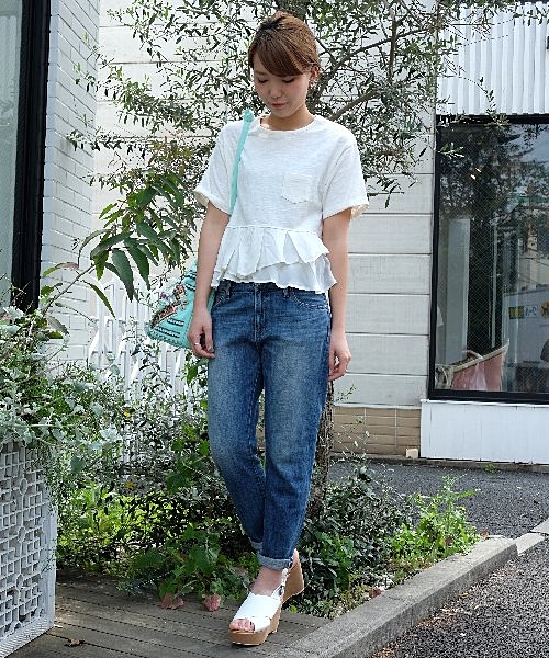 ゆるっとしたシルエットには女の子らしいフリルトップスでガーリーさをキープして。
