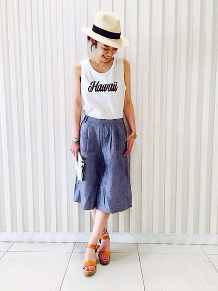 トレンドのロゴ入りノースリーブを、ウエストインして。