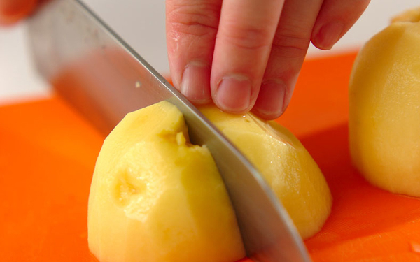 1、カリフラワーは小房に分け、ジャガイモは皮をむき、4等分にする。水からジャガイモをゆでる。