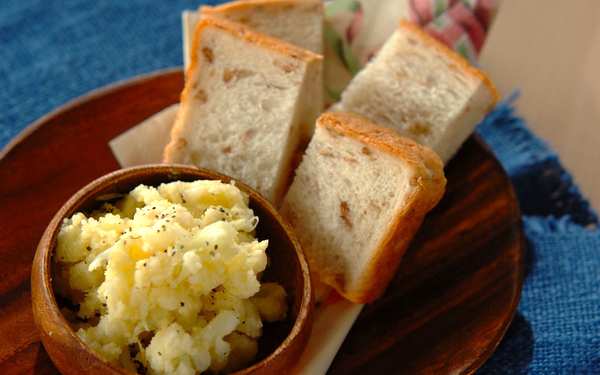 3、カリフラワーを加え、形が残る程度につぶす。塩を振って混ぜ、マヨネーズを加えてさらに混ぜる。器に盛り、粗びき黒コショウを振り、ライ麦パンを添える。