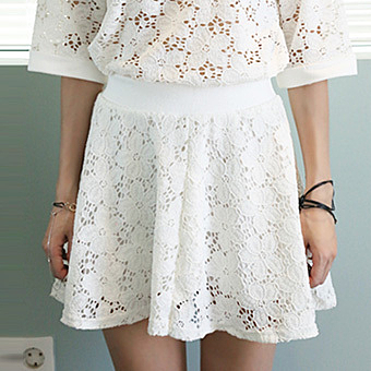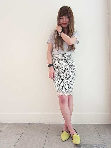 大柄のレースが特徴的なタイトスカートです。すっきりしたシルエットですが、裾の部分がラウンドカットになっていてちゃんと女の子らしさもあるのが嬉しいところ。