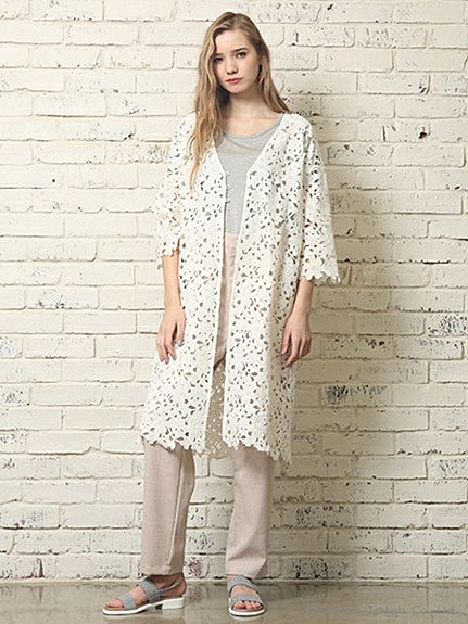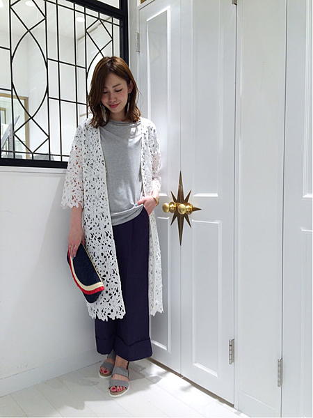 人気のレース素材のカーデをロング丈で。一気にフェミニンな印象のコーデにしてくれます。スニーカーやキャップなど使い方次第ではカジュアルも大人っぽくもなれるアイテムです。