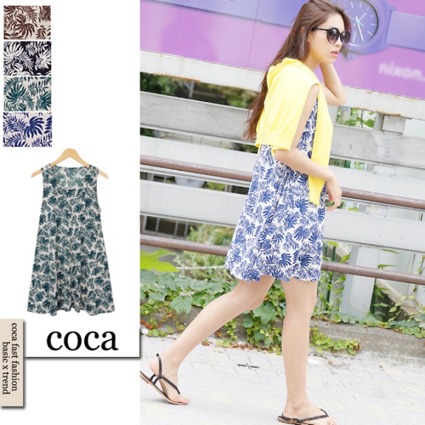 インパクト大のボタニカル柄タンクワンピ。1枚でも涼しげに着られますが、短めの着丈なので、下にパンツを合わせてチュニックとして着るのも良さそうです。