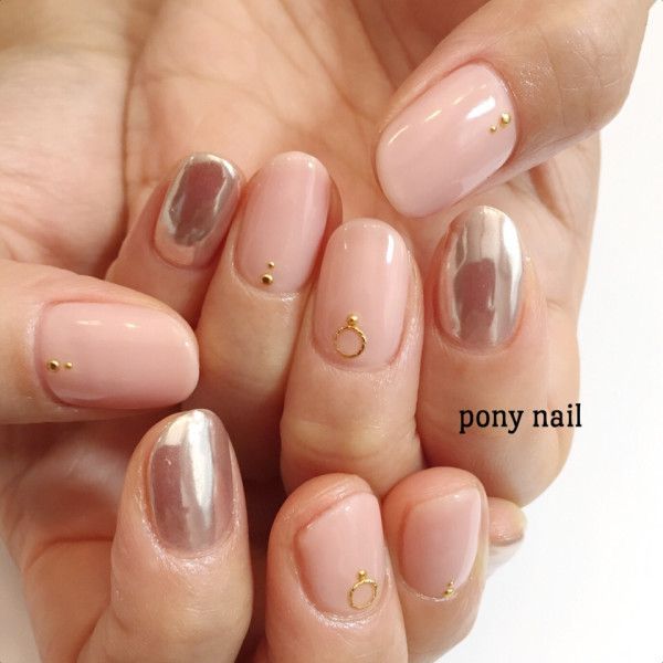 ピンクベージュでだと、肌馴染みが良いので全部の指をミラーネイルにしても