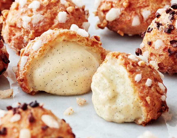 シュー生地は低温で焼き上げられていて、表面にはナッツやあられ糖がトッピングされています。
