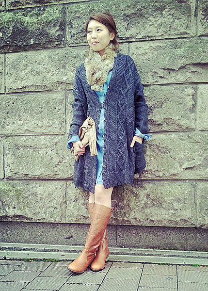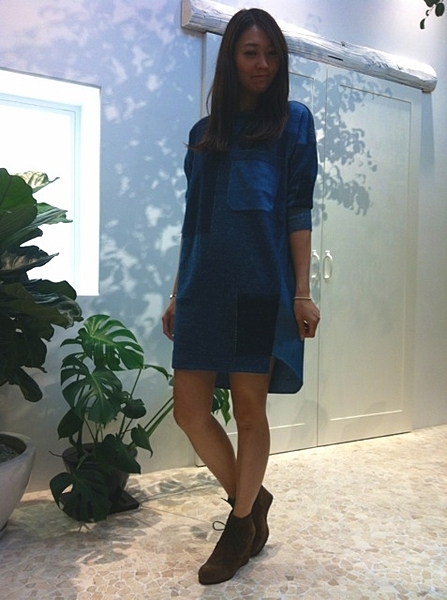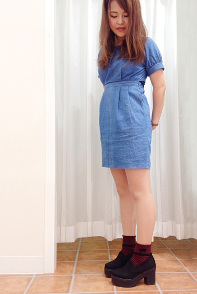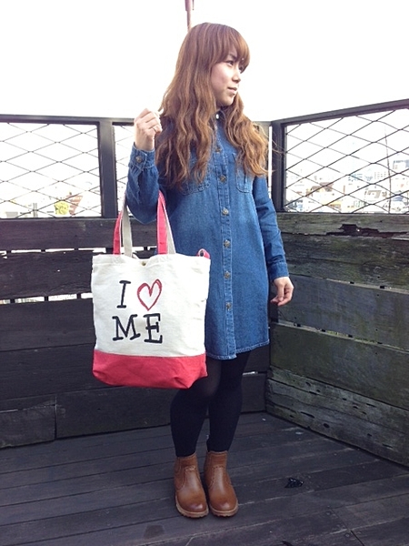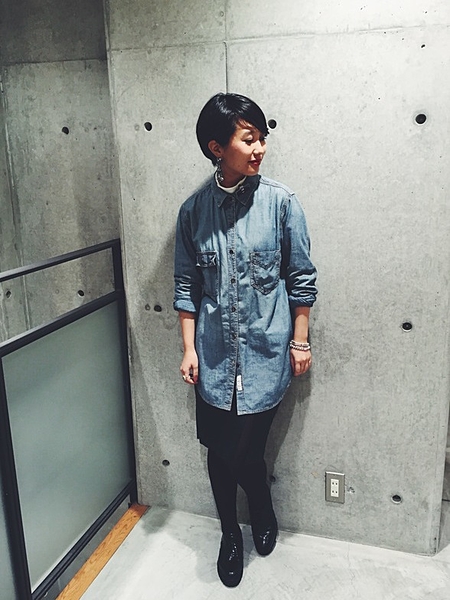 ダンガリーのデニムシャツワンピースにはベージュ系のシューズや小物がよくにあいますね♪
