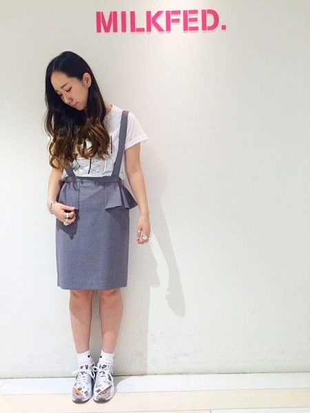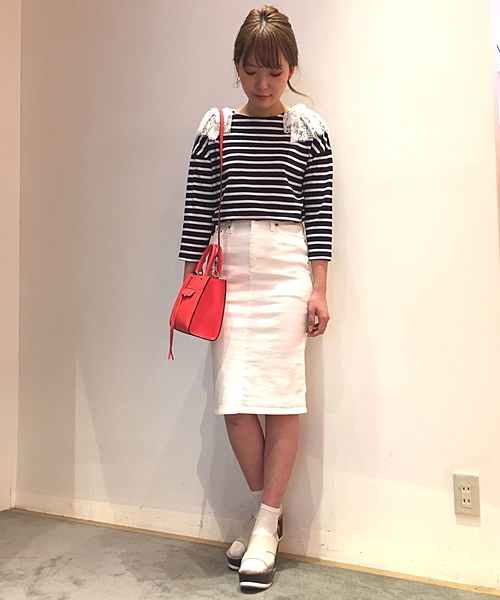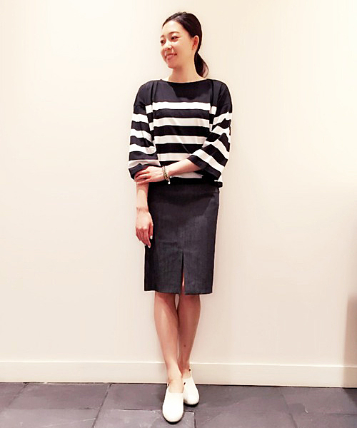 細いラインの入ったスカートが全体を引き締めてくれるから単調にならず印象的。