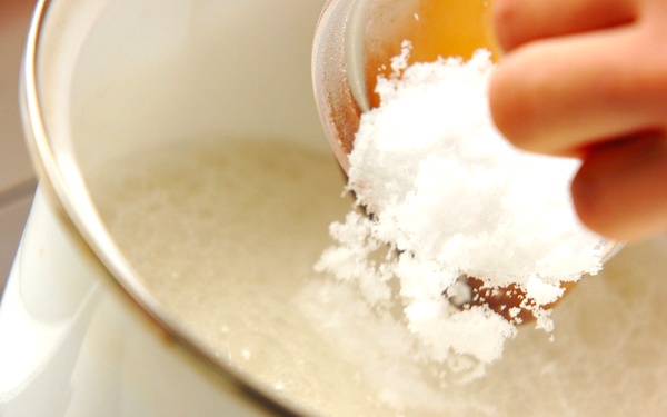 1、鍋に水、粉寒天を入れ、木ベラで混ぜてしっかり溶かし、中火にかける。混ぜながら沸騰したら砂糖を加えて沸騰状態で1~2分煮る。