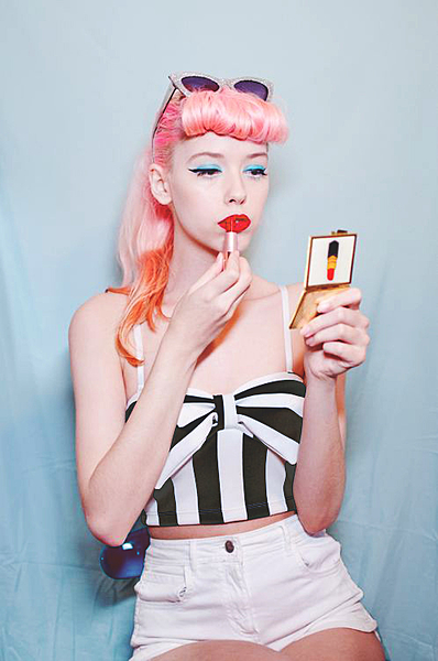 濃いめの血色チークに、カラーシャドウにカラーマスカラ、発色のよいネオンリップ...