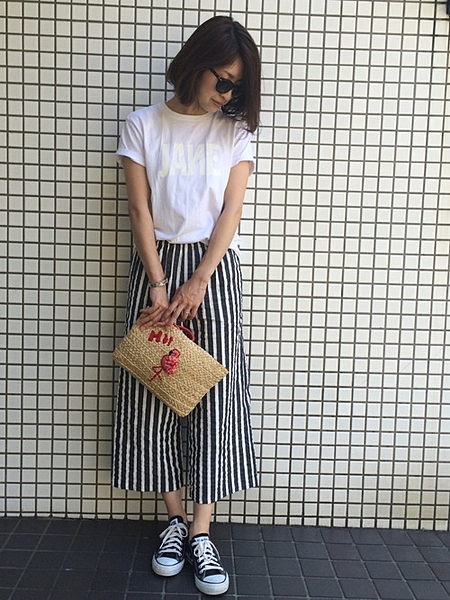 白Tに黒白ストライプ。