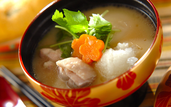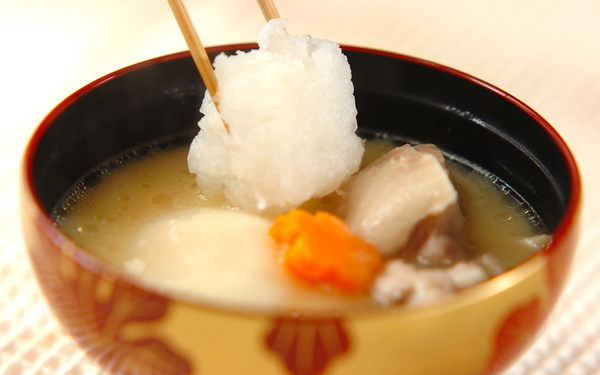 2、丸餅を入れ、丸餅が柔らかくなったら、白みそを溶き入れる。薄口しょうゆを加えて味を調え、お椀に盛って、大根おろしとミツバを添える。