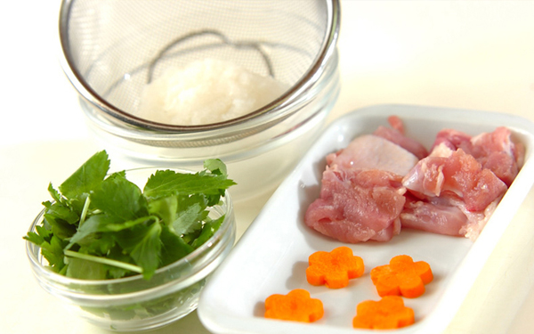 1、鍋にだし汁とニンジンを入れて強火にかけ、煮たったら鶏もも肉を加え、中火で煮る。