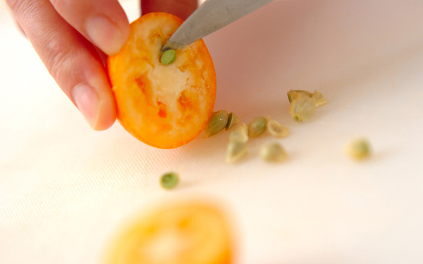 1、キンカンはひとつひとつ丁寧に洗い、ヘタを取って横半分にカットし、中の種を取り除く。