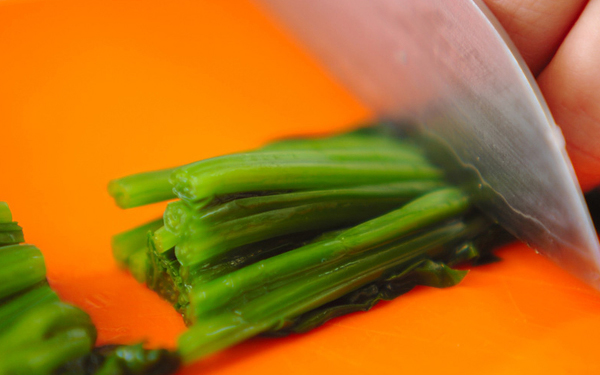 2、熱湯にホウレン草を根側から入れ、色が鮮やかになったら水に取る。粗熱が取れたら水気を絞り、根元を切り落として長さ3cmに切る。