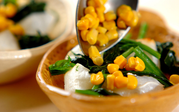 3、耐熱容器にホワイトソースとミートソースの1/4量を入れ角餅、ホウレン草、水煮コーンをのせる。