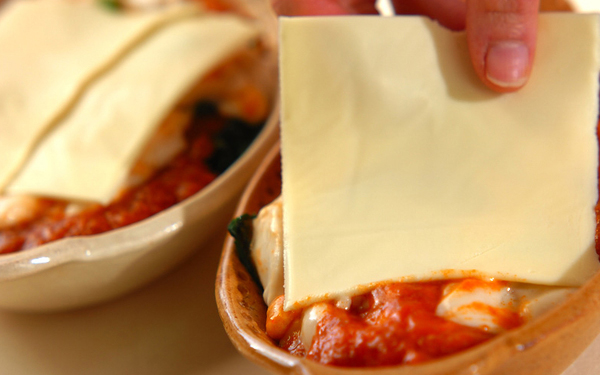 お好みでマカロニなどを加えれば、より本格的なラザニアに。耐熱容器にまずソースを敷いておくと、お餅がくっつきにくくなります。