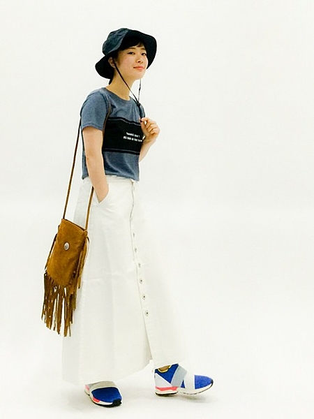 フリンジのバッグに白のロングスカートを合わせていて、一見、ボヘミアンなコーデかと思いきや。